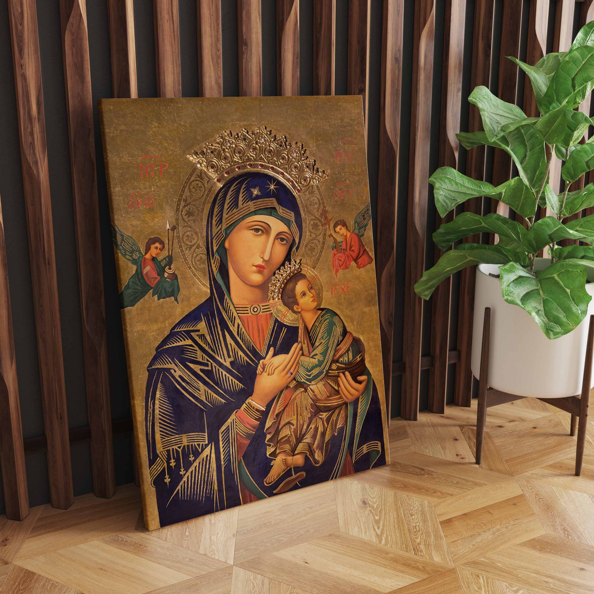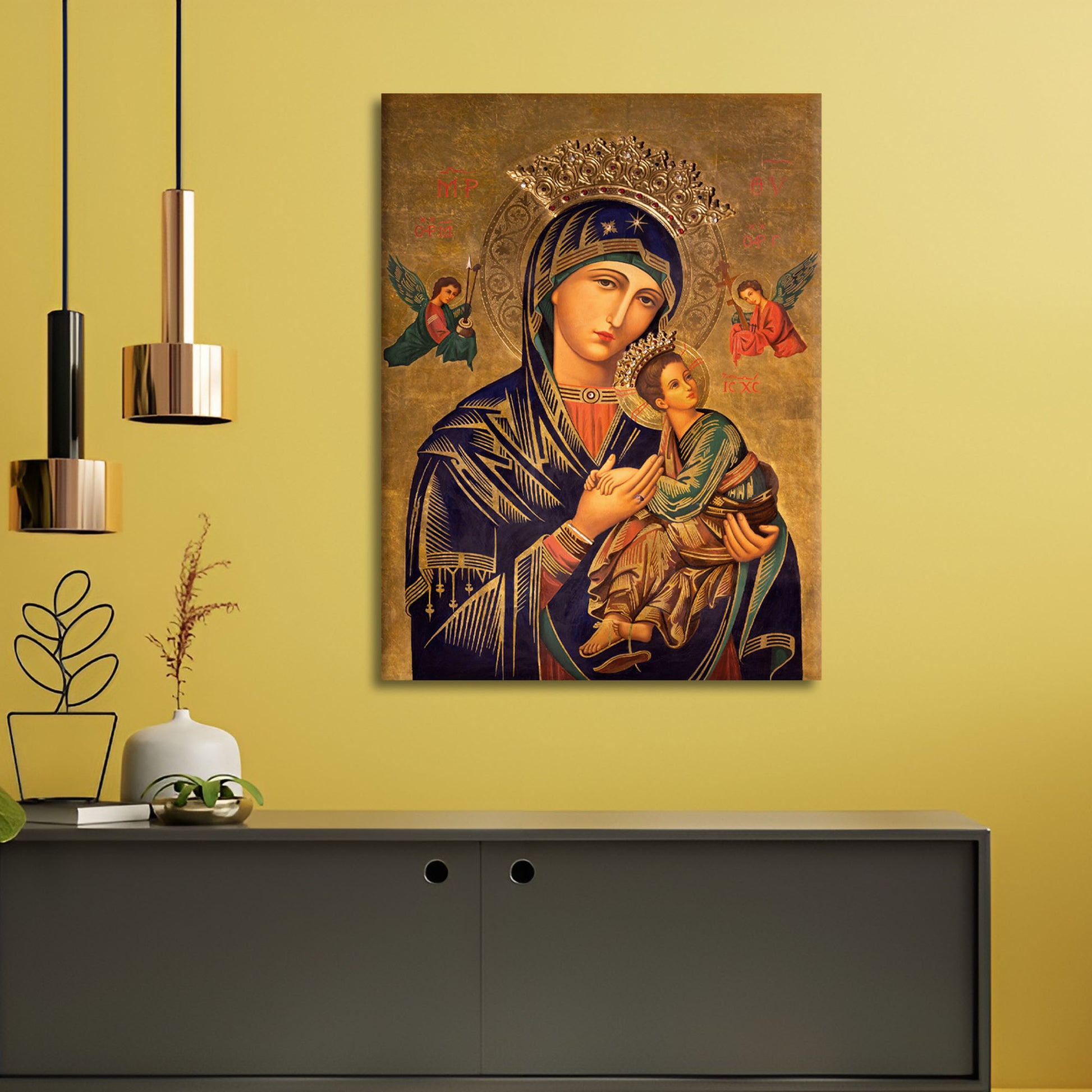 This extraordinary wall art encapsulates a profound moment of motherly love and spirituality. Fathima Mary, a symbol of grace and devotion, gently cradles her son, Jesus Christ, in her loving arms. Their embrace is the embodiment of an enduring bond, a mother's unyielding love, and a divine connection.