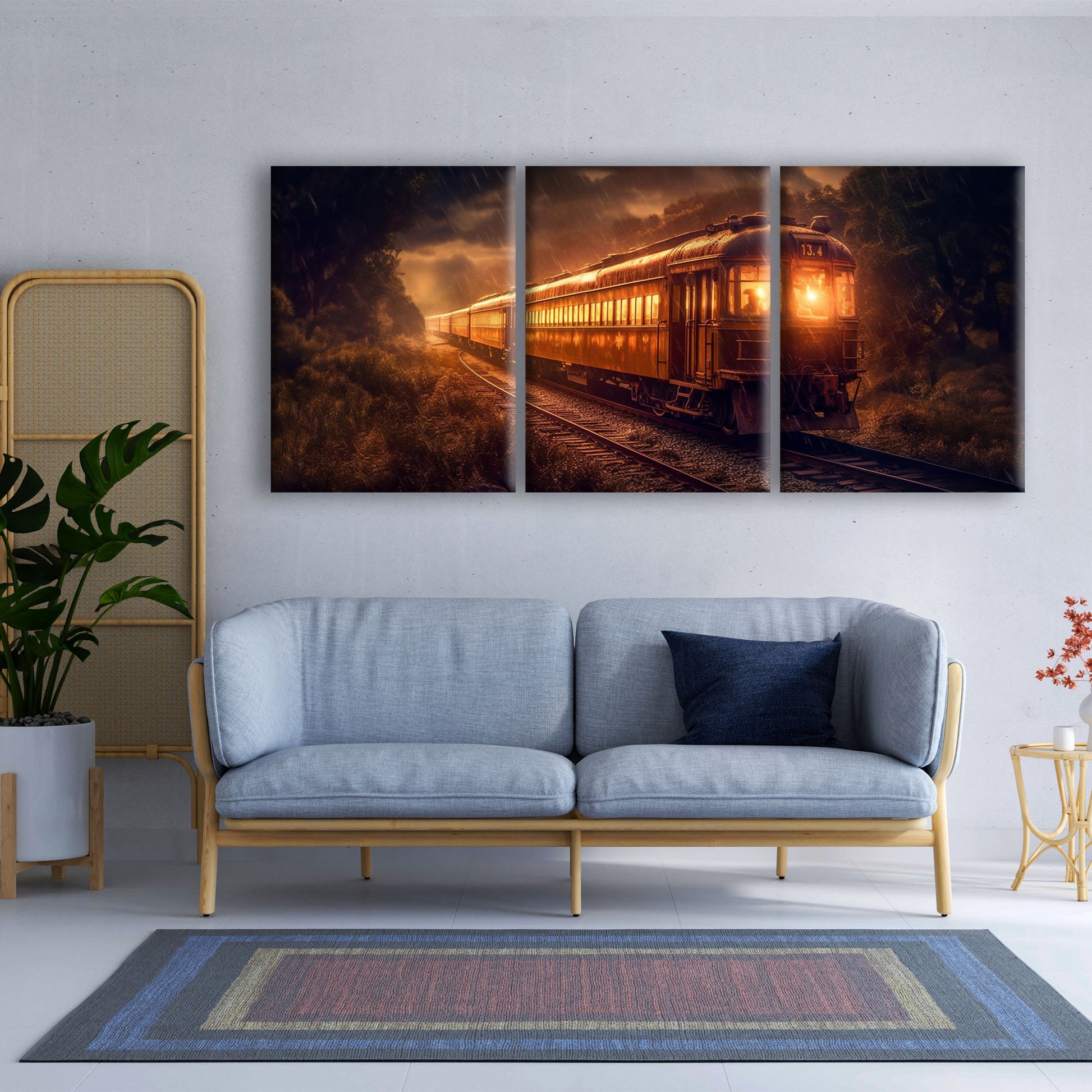Printed on premium-quality fabric, our wall art ensures outstanding durability and unmatched visual clarity. The fabric's texture enhances the depth and dimension of the artwork, drawing you into a scene where the timeless beauty of the forest intermingles with the industrial splendor of the steam train, all set against a captivating blackish orange backdrop.