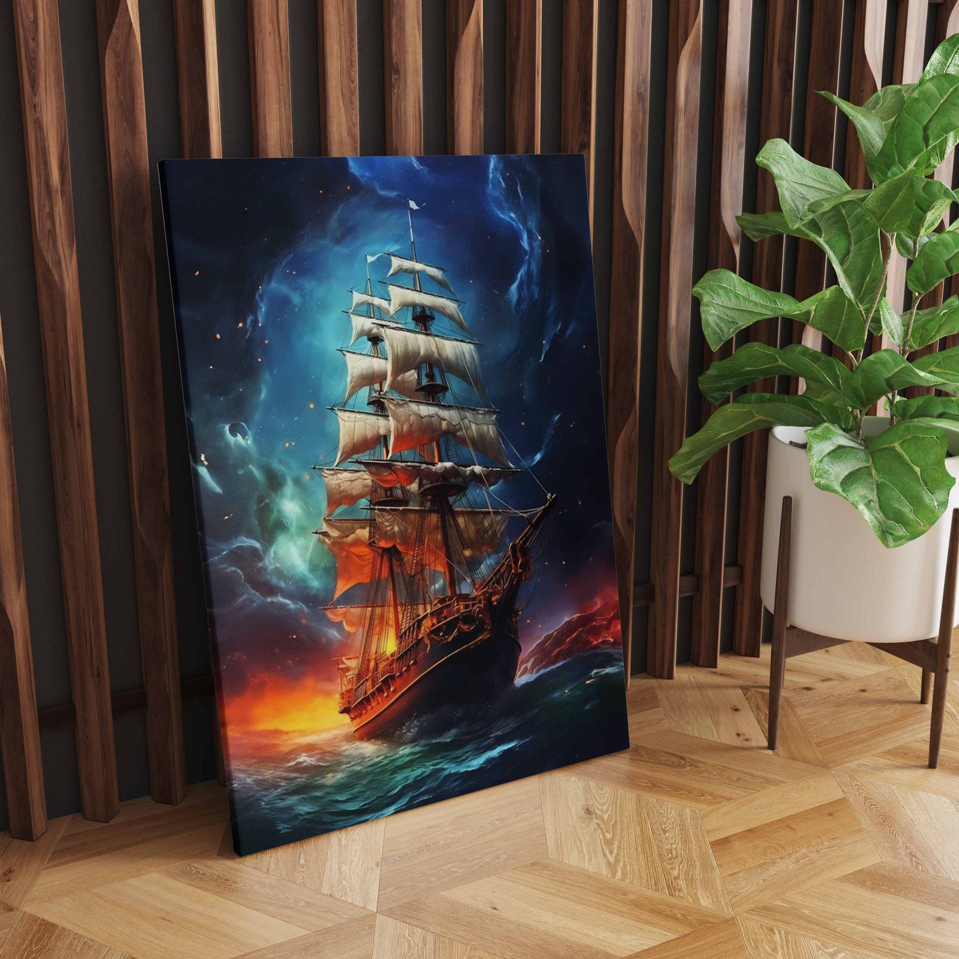 Journey to Resilience: A Wall Art Depicting an AI Sailing Ship Sailing Away from the Flames - Embrace Hope Amidst Adversity - S05E80