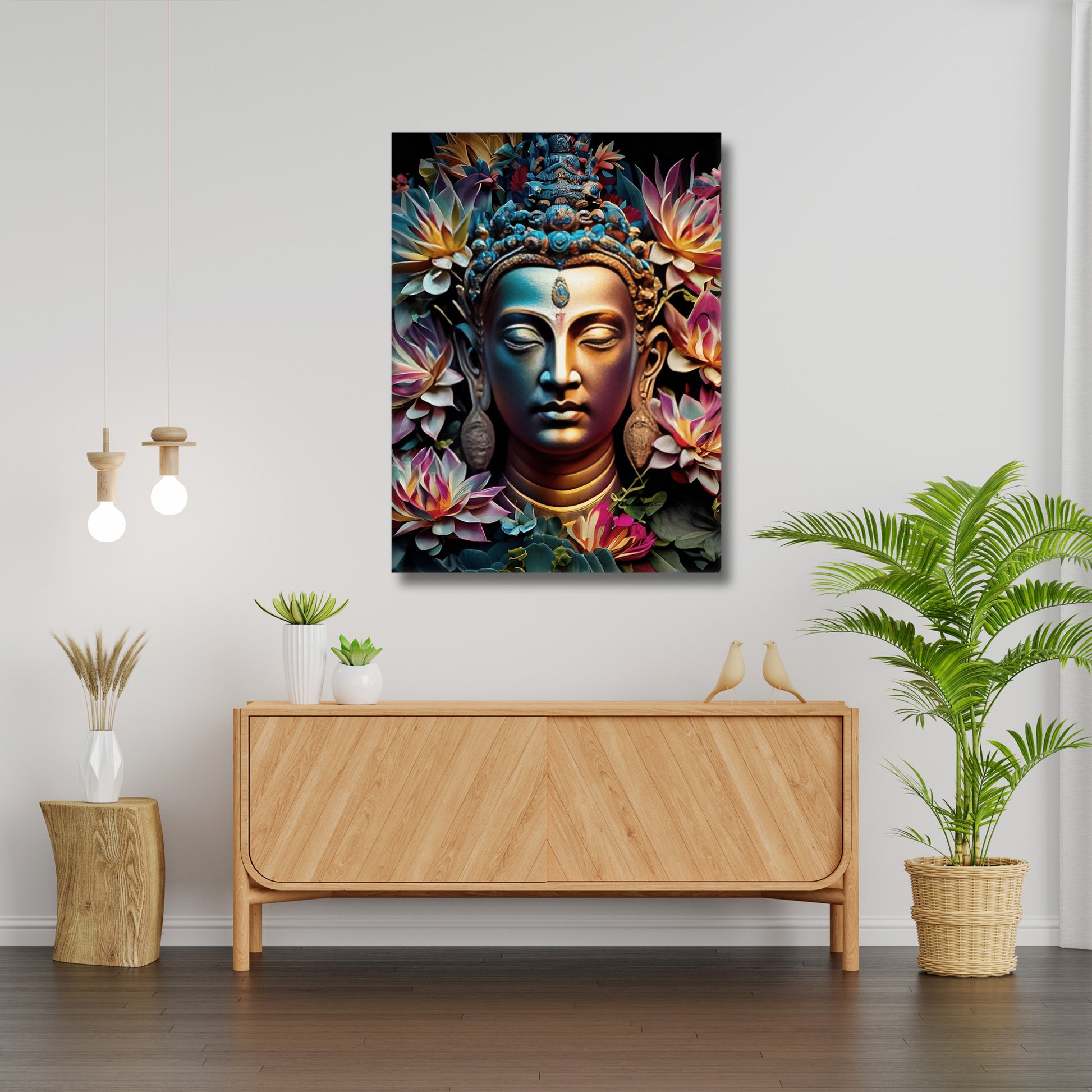 This artwork captures the essence of his teachings — the idea that amidst life's intricate tapestry, one can find inner peace and enlightenment. Just as flowers bloom in their own time, Buddha's wisdom teaches us to grow and evolve at our own pace. The soft hues of the floral background harmonize with the gentle energy Lord Buddha exudes, reminding us that peace and enlightenment are attainable in any environment, no matter how intricate.