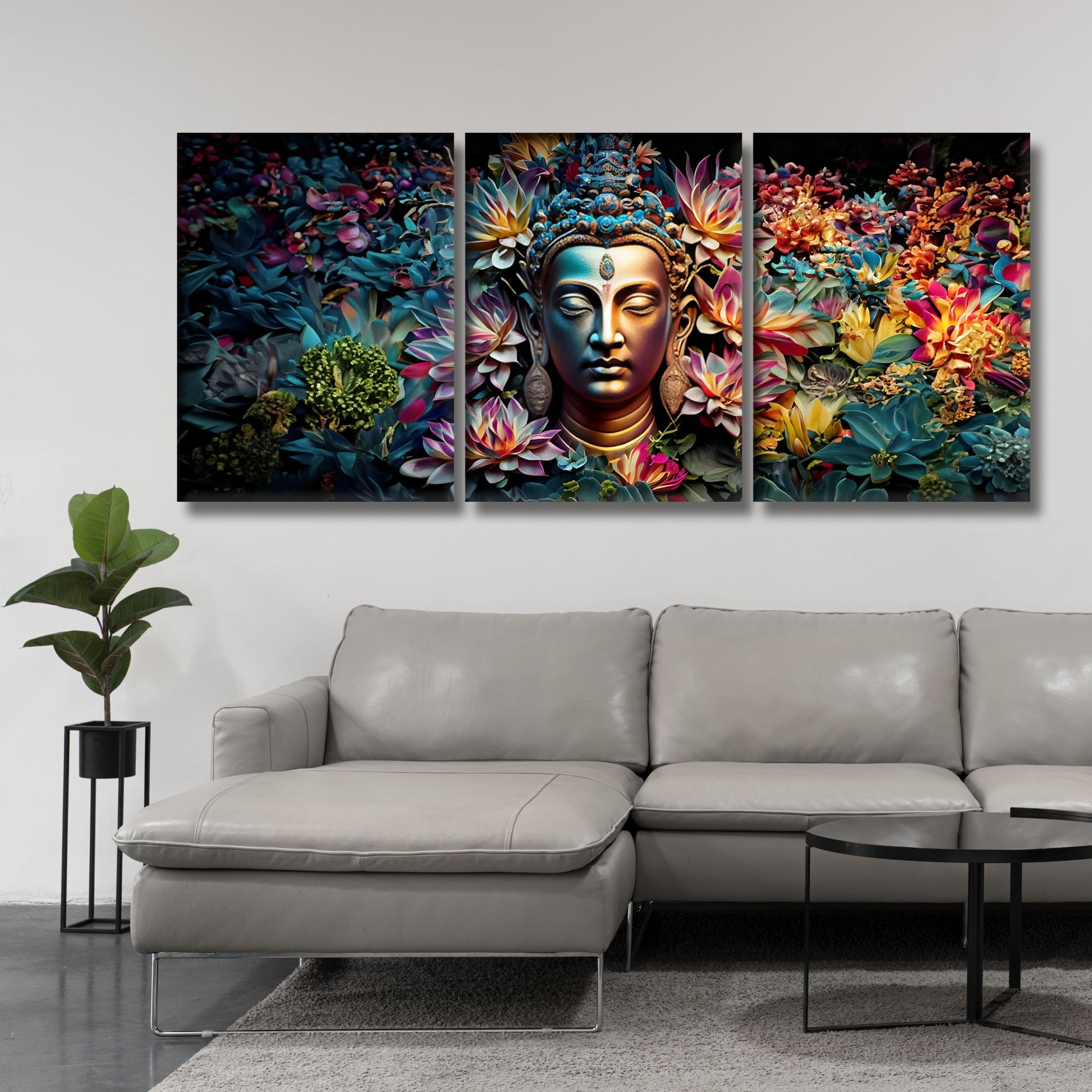 This exquisite wall art masterpiece pays homage to the revered figure of Lord Buddha, an embodiment of peace, wisdom, and enlightenment. Set against a resplendent floral background, this artwork encapsulates the tranquility and serenity that Buddha's teachings bring into the world.