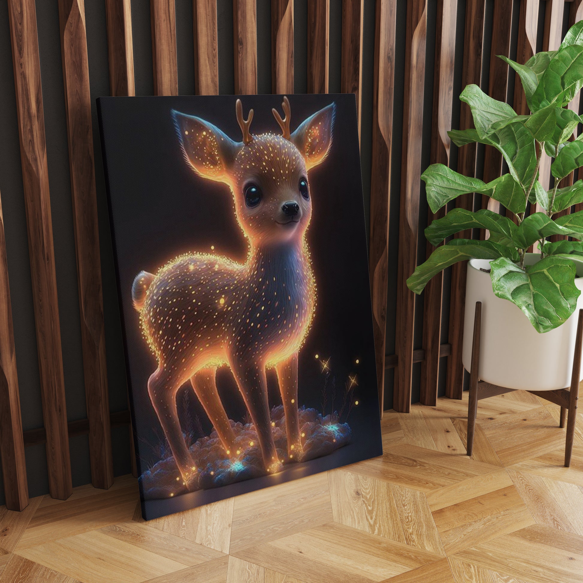 Whether you are a nature lover, an admirer of gentle creatures, or simply seeking to infuse your space with a touch of enchantment, our "Luminescent Serenity" collection is the perfect choice. Let these fabric prints grace your walls, allowing the captivating image of the glowing baby deer to transport you to a realm of tranquility and awe.