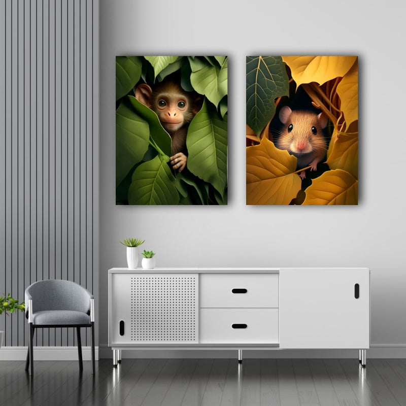 Indulge your senses in the serene beauty of the natural world with our exceptional collection of wall art fabric prints, "Nature's Delight: Animals Peeking from Leaves." Immerse yourself in a captivating journey as you explore the hidden treasures of wildlife amidst a lush tapestry of foliage.