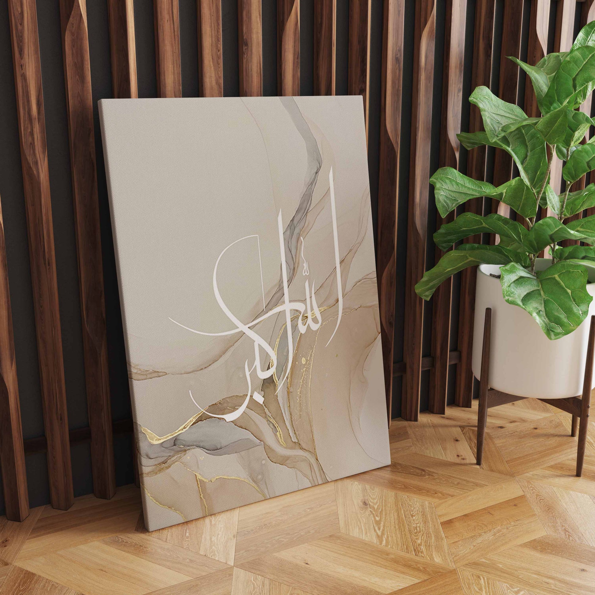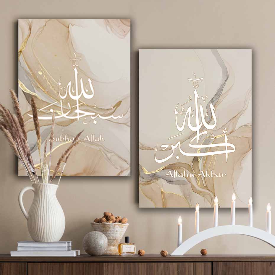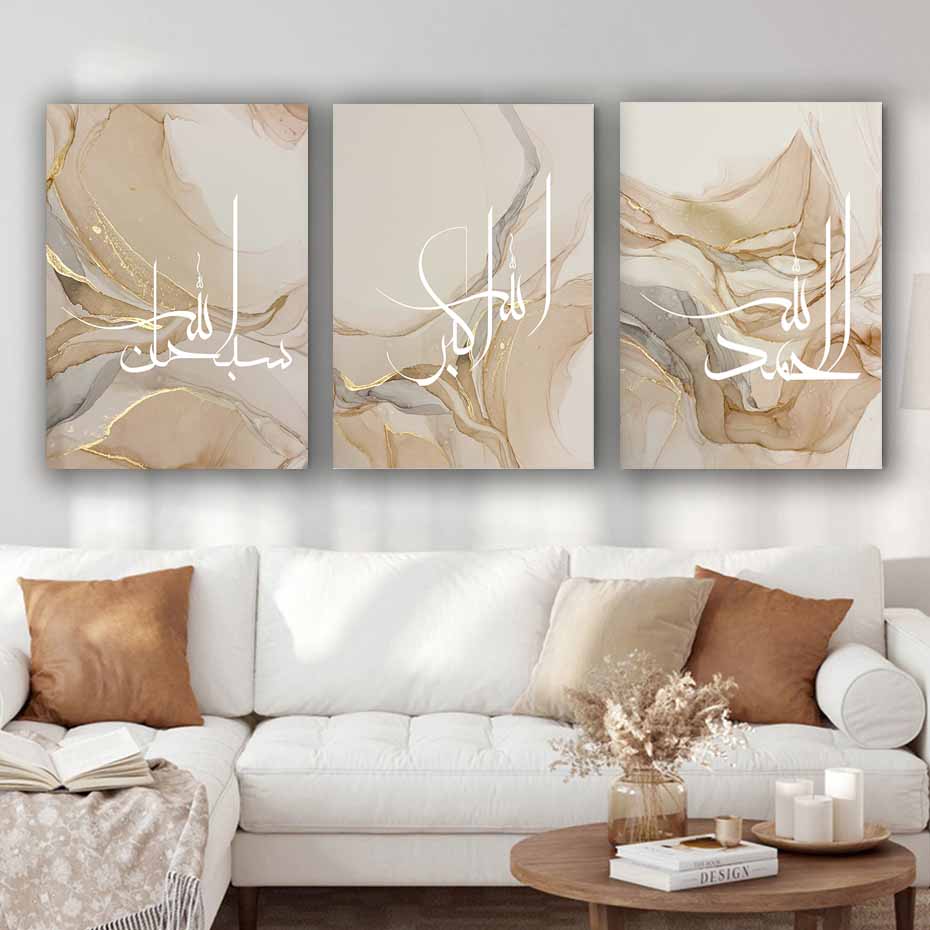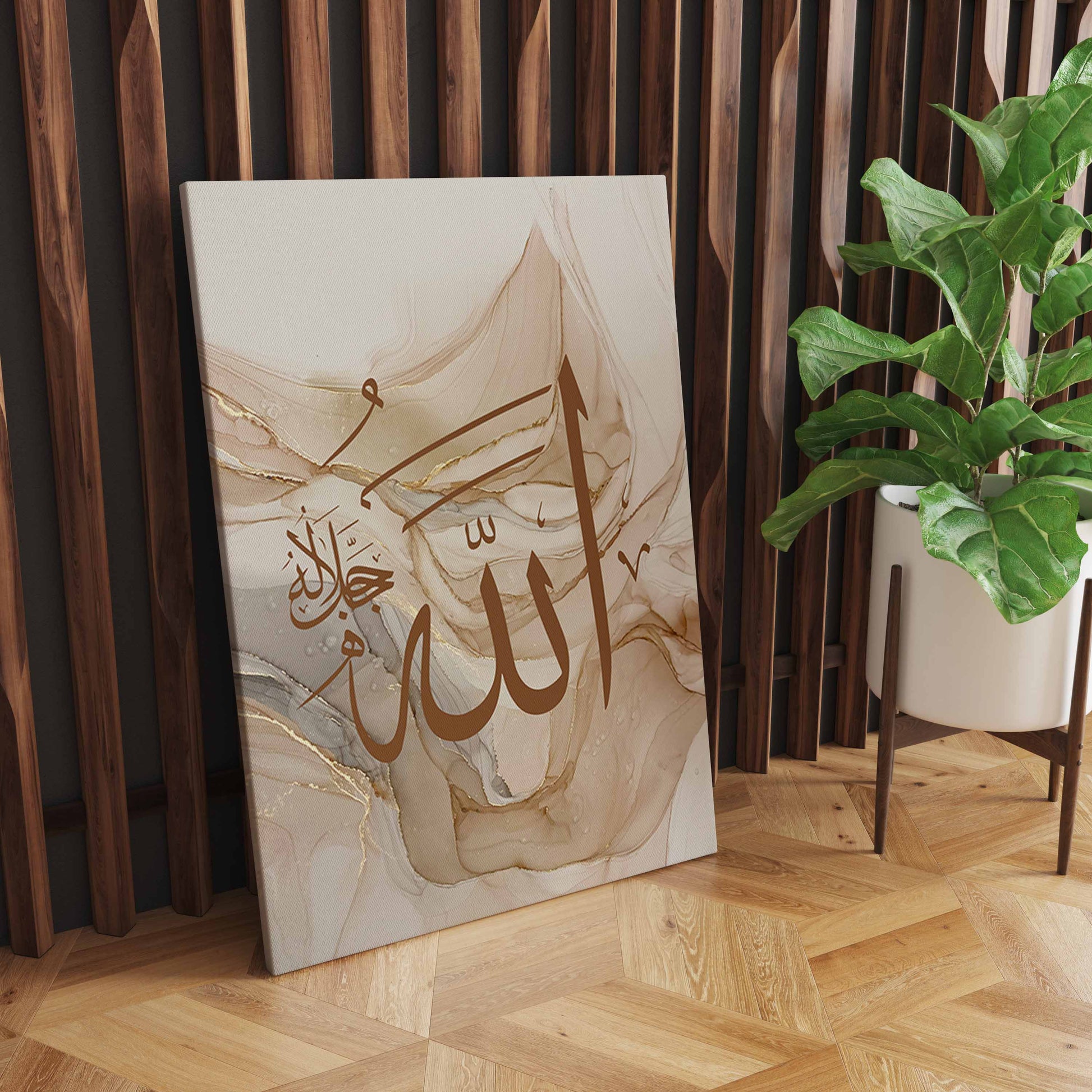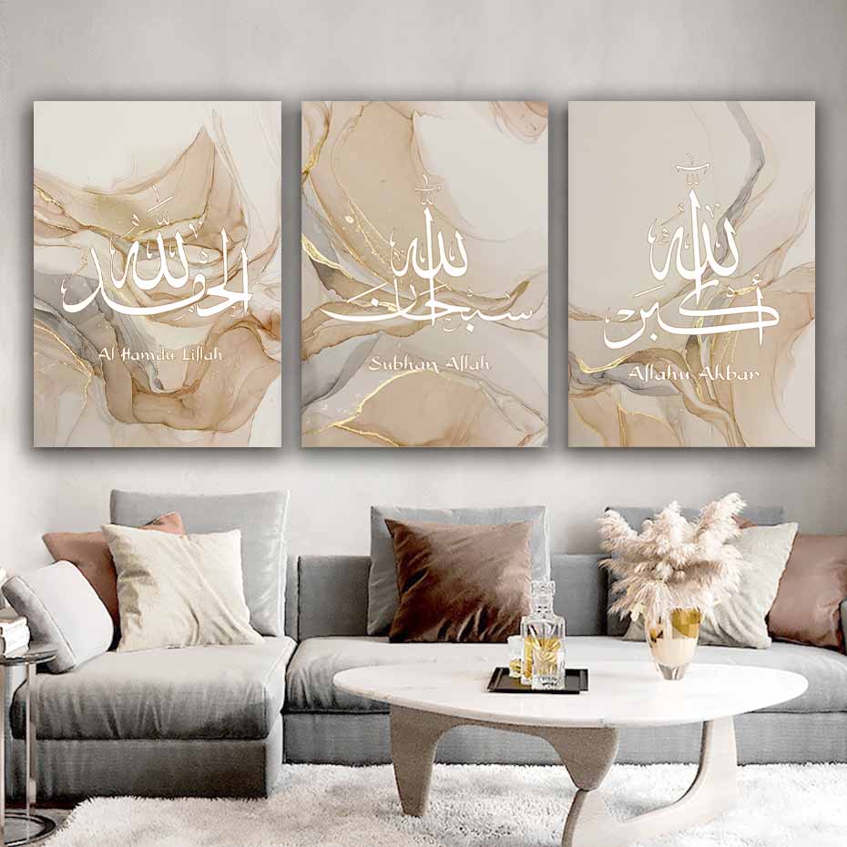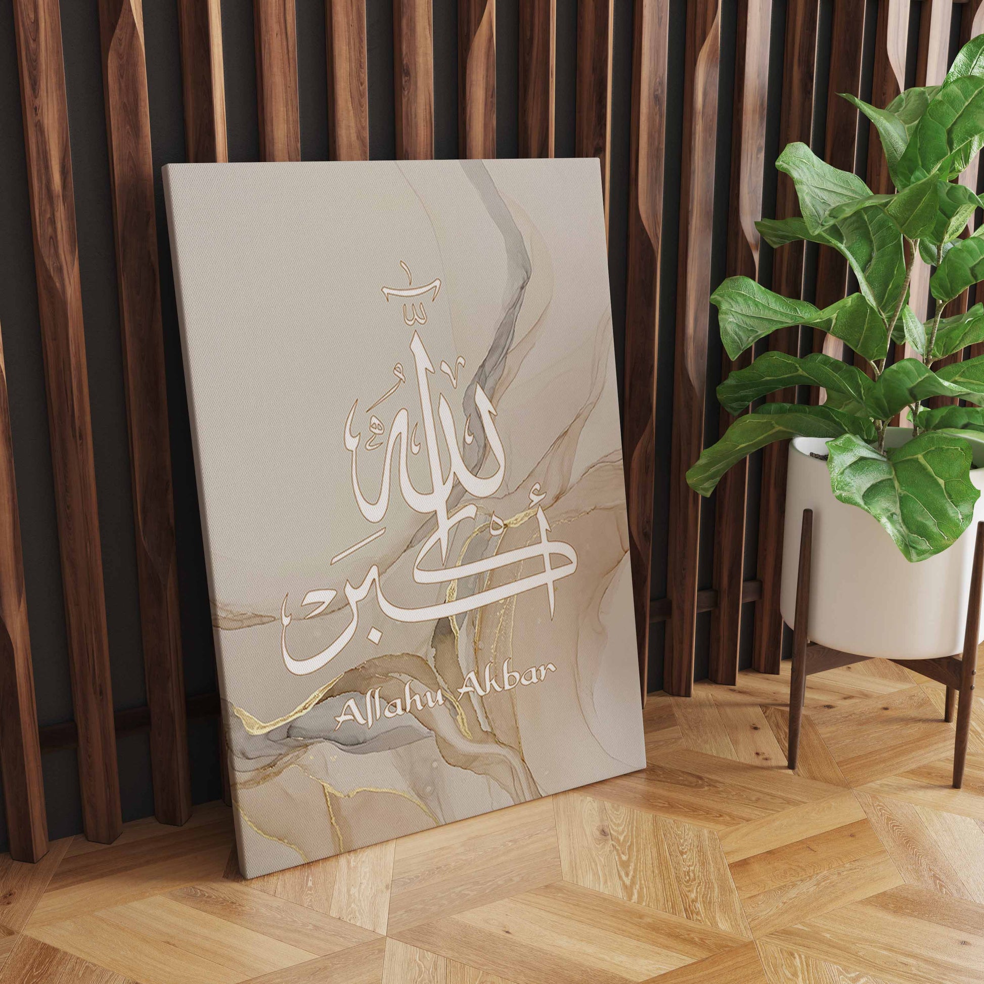 Transform your living room into a sanctuary of beauty and serenity with our Islamic Calligraphy Allahu Akbar Beige Gold Marble Fluid Abstract Fabric Printed Wall Art. Immerse yourself in the elegance of Islamic art and elevate your home decor to new heights. Order now and enjoy the harmonious blend of contemporary design and timeless spirituality